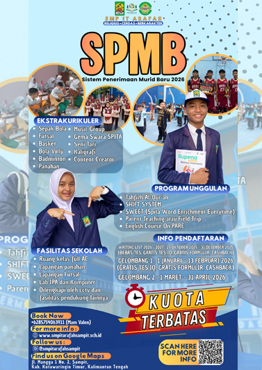 SMP Islam Terpadu Arafah kembali menunjukkan komitmennya dalam mengembangkan potensi akademik siswa melalui kegiatan SIGMA Competition 2025, sebuah ajang kompetisi sains tingkat SD/MI se-Kabupaten Kotawaringin Timur. Kegiatan ini berlangsung meriah pada Sabtu, 18 Oktober 2025, di Aula SMP IT Arafah Sampit.